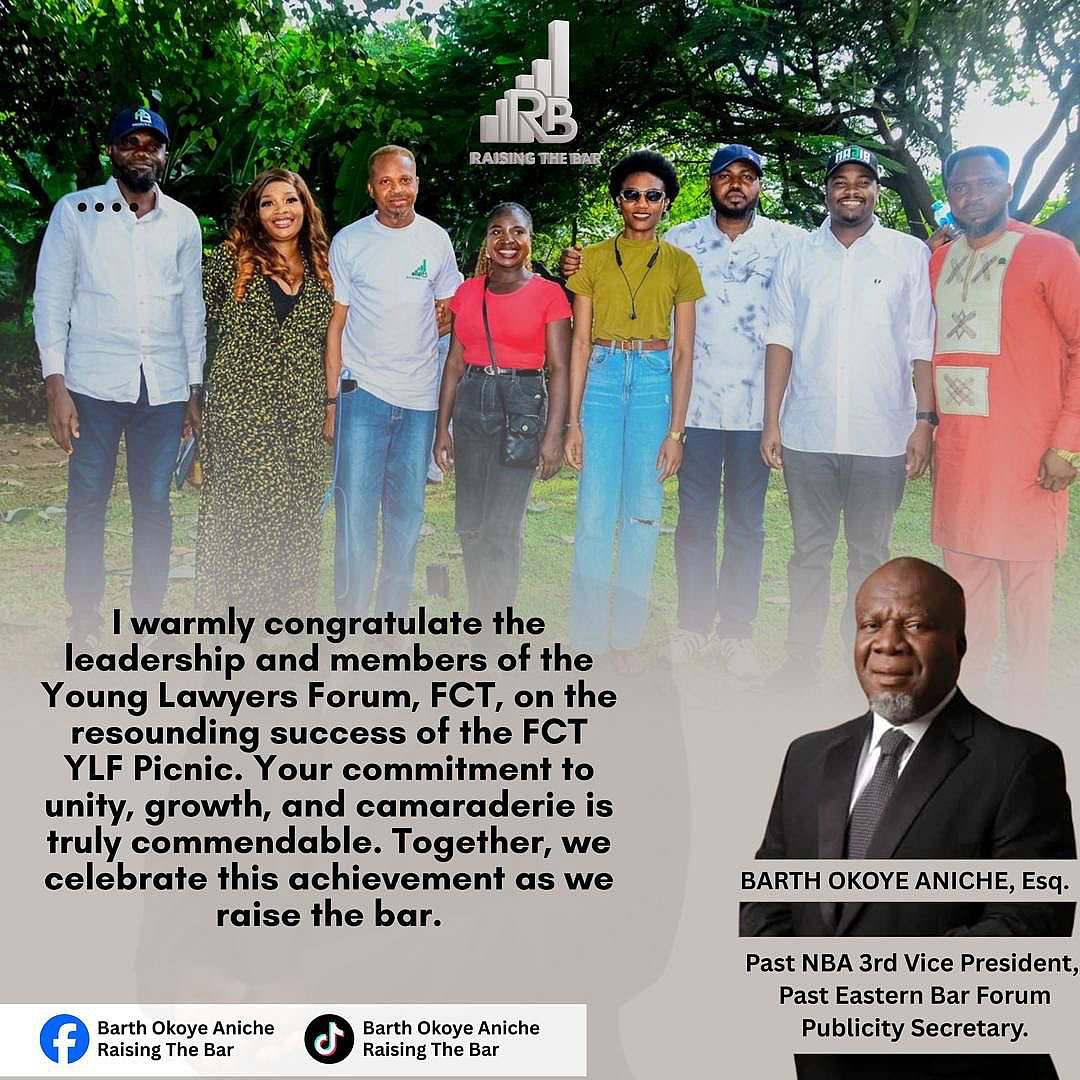 I extend my heartfelt congratulations to the Nigerian Bar Association – Young Lawyers Forum (NBA-YLF) of the FCT branches of Gwagwalada, Garki, Bwari, Nyanya, and Abuja, and to the respective forums under these branches, for the resounding success of your recently held picnic.