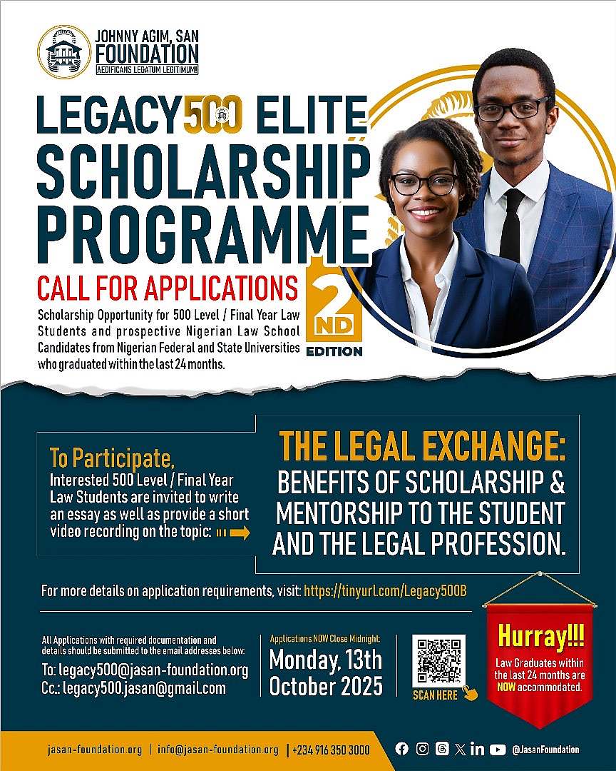 The Foundation recognises that in addition to the current 500 Level / Final Year Law Students, there are more amply qualified and indigent law graduates awaiting admission into the Nigerian Law School and who can benefit from this nouvelle elite scholarship programme.This extension, expansion, and inclusion, therefore, is to ensure fairness and gives room for the highest quality of submissions from across the country. It further reflects the Foundation’s commitment to accessibility and support for passionate law graduates who, though qualified, may be unable to proceed to Law School due to financial or systemic delays. It ensures that no promising future legal practitioner is left behind.