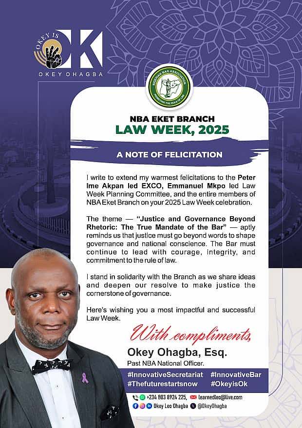 I write to extend my warmest felicitations to the Peter Ime Akpan led EXCO, Emmanuel Mkpo led Law Week Planning Committee, and the entire members of NBA Eket Branch on your 2025 Law Week celebration.