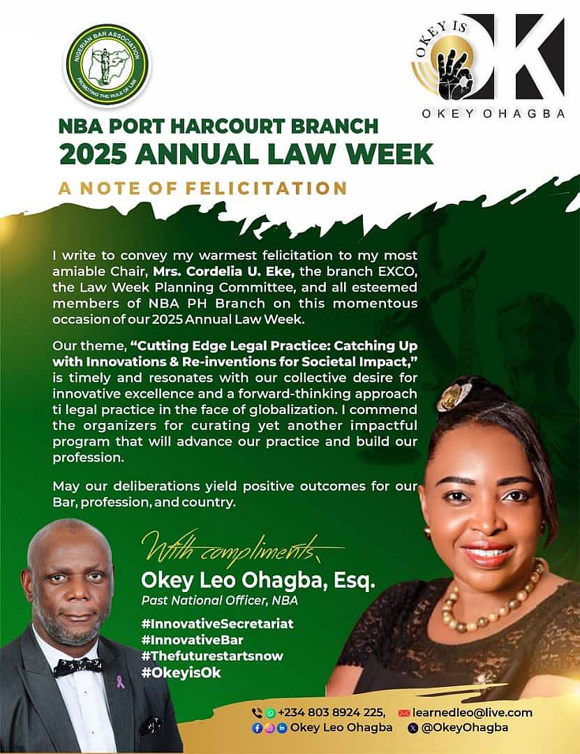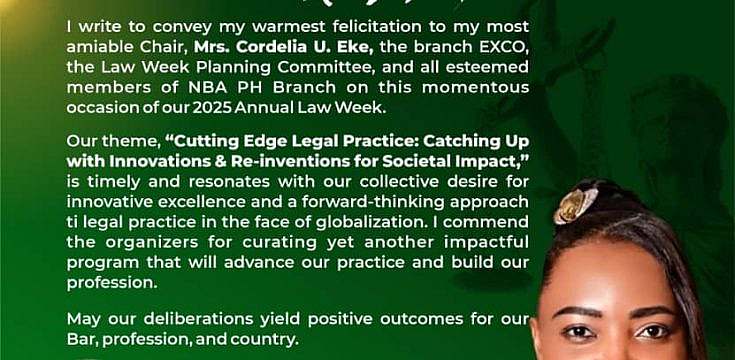 I write to convey my warmest felicitation to my most amiable Chair, Mrs. Cordelia U. Eke, the branch EXCO, the Law Week Planning Committee, and all esteemed members of NBA PH Branch on this momentous occasion of our 2025 Annual Law Week.